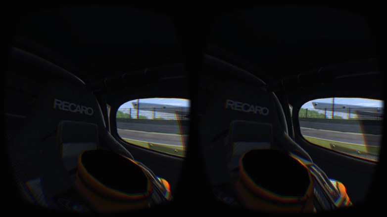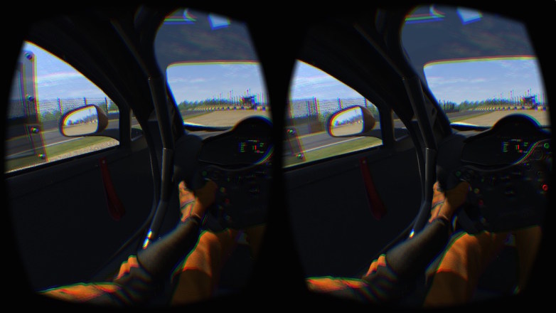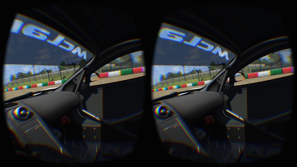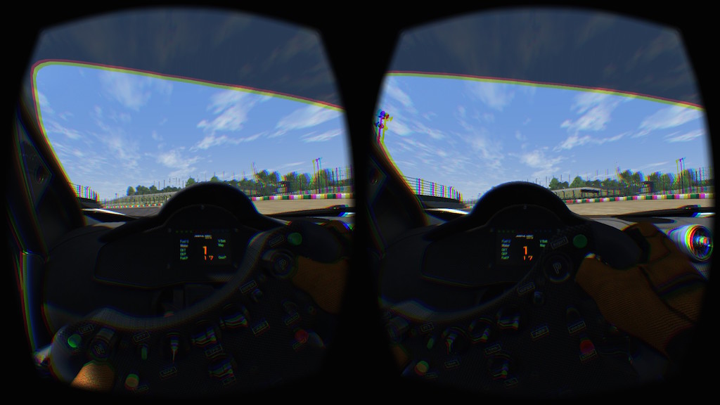 McLaren MP4/12C GT3のコックピットに座って頭を動かしてみると、車内の様子がまさにVRで映し出されます。 75Hzで滑らか且つ、頭の動きにほぼ遅延なく画面が動くので、リアルタイム性が半端ない。 遅延があるとメチャクチャ酔うらしいので、昔マリオカートで酔ったくらい3D酔いに弱い自分でも、これならなんとかなりそう。 (但し一応試したジェットコースターのゲームでは、遅延なくても2分ほどで酔いましたが) 左を向くとドアガラスがあるし、斜め後ろを見ればロールバーが、ハンドルに顔を近づけることも出来るし、ゲーム内でハンドルを握っているポリゴンの腕と現実の腕の位置が見事に一致し、奇妙な現実感が。(このキャプチャ画像が色ズレしているのはレンズの色収差を逆算した仕様で、HMDで見るときは正常に見える)