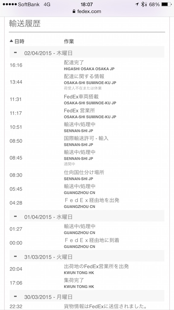 意外にも発送元は香港。すぐ近くやないけ! その後広州でトランジットされ、翌朝には関空着。その日の内にFedEXの大阪拠点へ運ばれ、その日の内に配達完了していました。速っ!! しかも例の消費税4% × 地方消費税25% (今の税率は知らんけど)のややこしい税金はかからず。 やはりFedEX経由だと不要なのか。う〜んこれまでに数知れず個人輸入したけど、相変わらず良く分からない。(でもFedEXの送料は高い) ともかくも、発注してから1週間で納品されてしまいました。