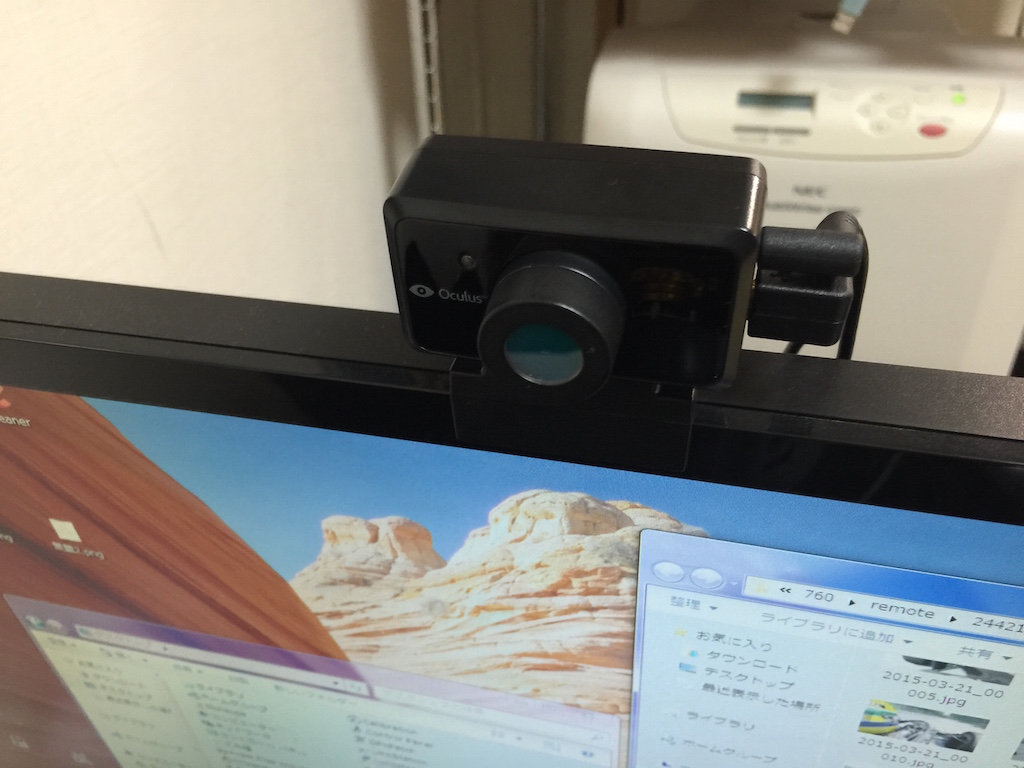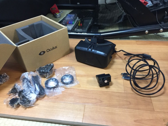 到着した日は泥酔して帰宅したので、翌日帰宅後からセットアップ開始。 Oculus Rift本体とPCはHDMIとUSBで接続しますが、GeForce GTX670はHDMI出力が1つしか無いので付属していたDVI変換アダプタを使います。 それと、ヘッドトラッキング用の赤外線カメラを少し離れたところに設置(大抵は液晶ディスプレイの上)とあるので、そのようにします。 カメラもUSBでPCと接続し、さらにカメラと本体もケーブルで繋ぎます。 本体からケーブルで繋がっている先のコントローラには電源アダプタも繋ぐので、あれよあれよという間にハンコン周りがケーブルだらけになりました。 もうあと5年もすればこの手の機材もワイヤレスになるのかも知れませんが、今はまだ開発者用、やむを得ないところです。