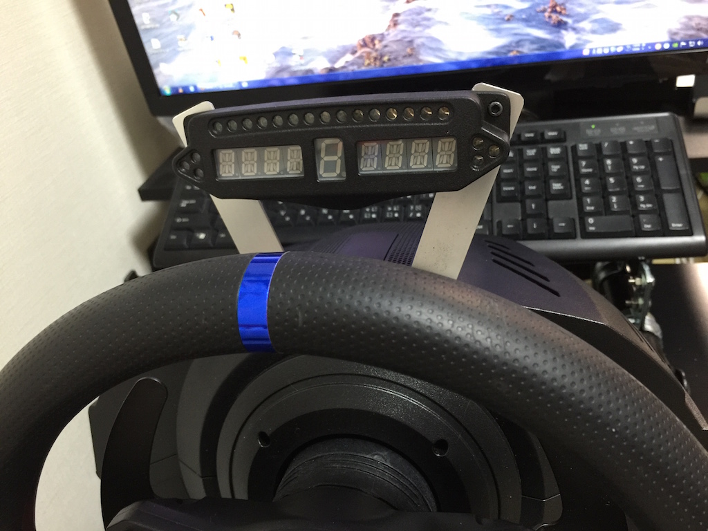超テキトーにハンドルにテープで固定して、しばらく走ってみて、マネージャに戻って調整して再度走って・・・を繰り返し、だいぶまともに動作するようになってきました。 エンジン回転が何RPMでどのランプが付くかとかをものすごく細かく調整できるので、1990F1のレブリミットに合わせたり、LEDが眩しいので輝度を落としてみたりとかいろいろ調整して、快適に走れるようになってきました。 とは言え、テープでの固定ではやはりすぐ落ちてしまうし、そもそもハンドル固定するとステアリングを切るたびにUSBケーブルが動いてうっとおしいので、去年までのメルセデスやレッドブルみたく、インパネ固定風にしようと、ハンドル裏の本体上部にアルミステーで固定してみました。