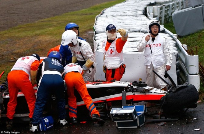 台風による天候の乱れもあり雨天レースとなっていた43周目のダンロップカーブ出口でそれは起こった。 42周目に同じカーブで、ザウバーのエイドリアン・スーティルがスピンを喫し、タイヤバリアにクラッシュした。