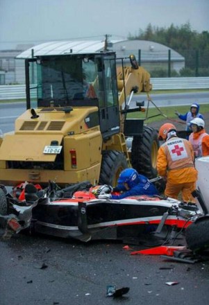 よくある何でもないクラッシュで、迅速な鈴鹿のマーシャルはすぐにクレーンでザウバーマシンを釣り上げ、コース外に撤去しようとした。 ところがそのわずか2分後、まったく同じ箇所でコントロールを失ったマルシャのジュール・ビアンキのマシンが、あまりにも不幸なことにそのクレーン車に突っ込んでしまったのだ。