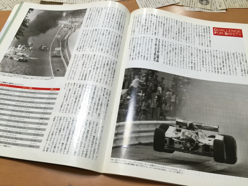 「F1グランプリ特集」1994年3月号の「CHALLENGE FOR SAFETY」は、F1グランプリが始まった1950年代から、1980年代までに起こった死亡事故を検証した記事である。 初期のモータースポーツでは全く考慮されなかったドライバーの安全性について、数々の安全装備で年々それが高められたことを伝えている。