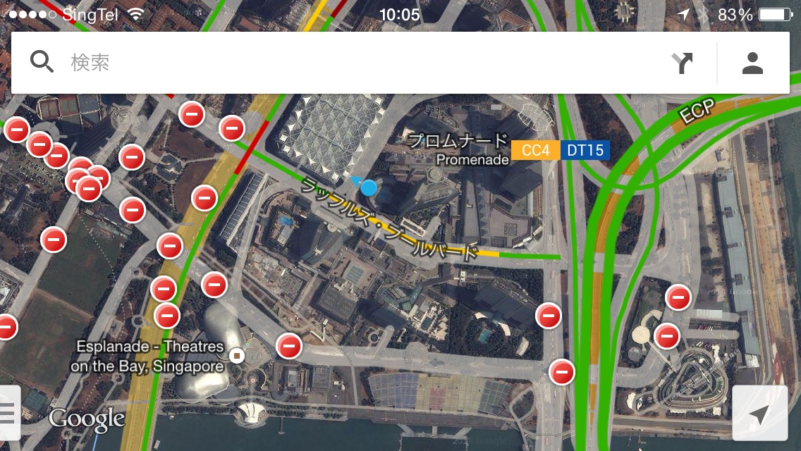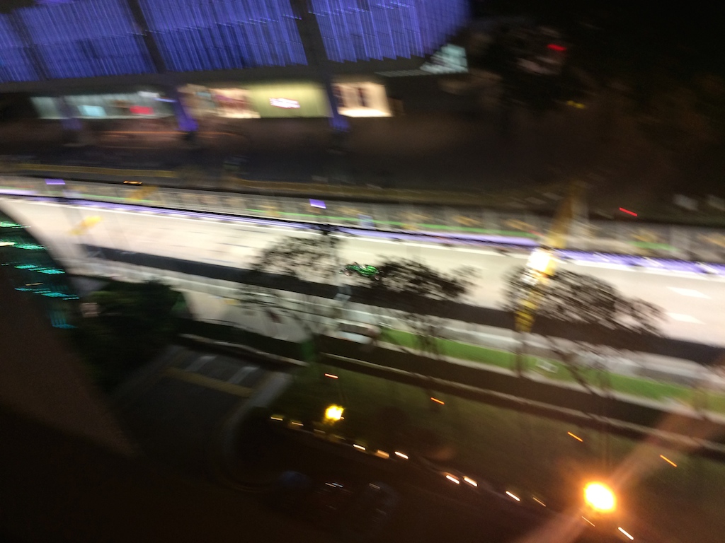 なんじゃ、超近いじゃん! ほんの1ブロック程度の距離で、普段なら歩いて5分の距離です。が、今はグランプリウィーク。 ご覧のとおり、マリーナ・マンダリンはサーキットの内側にあるホテルなので、四方の道がすべて交通規制(というかコースなので人の立ち入りすら出来ない)。 地下のショッピングモールをくぐって道の北側に渡り、コース脇も通行規制があるのでグルっと大回りして、5分で行ける距離を40分くらいかかってなんとかたどり着きました。 (実はもっと近道があって、帰りはそこを通ったので、実際は10分くらいの距離でした)