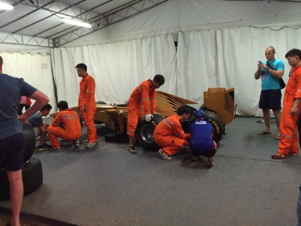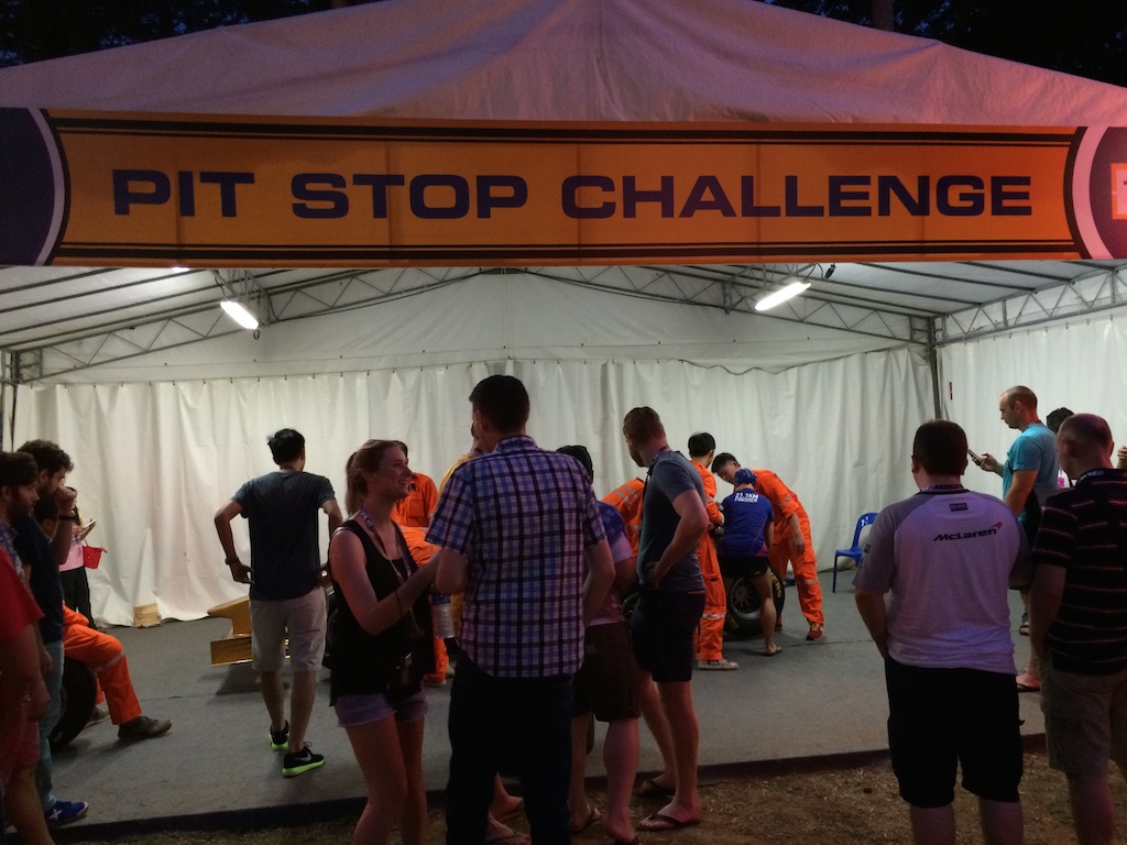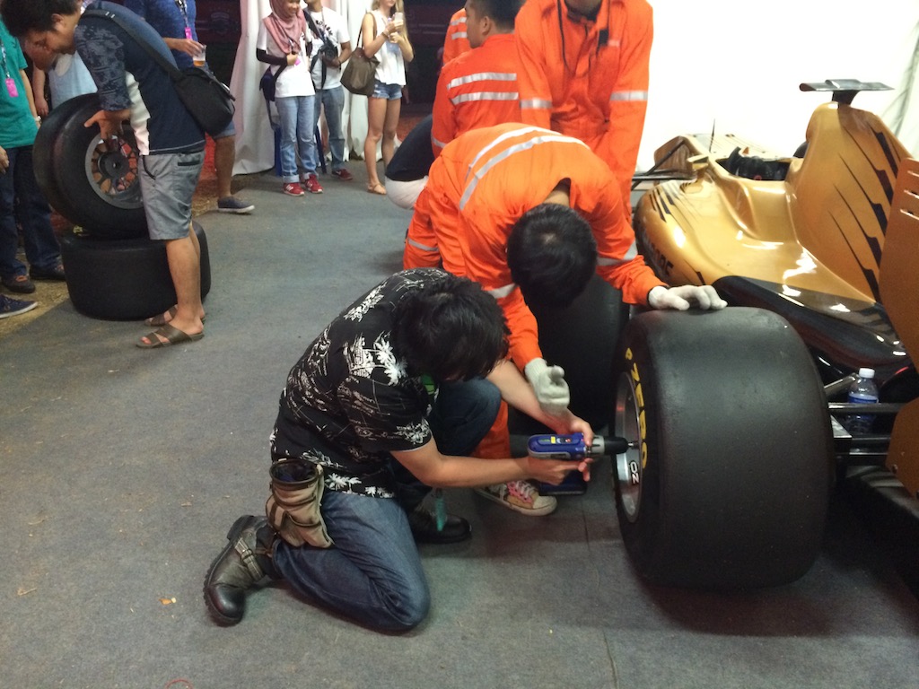 一体なんのタトゥーを彫ってもらえるのか分かりませんでしたが(やっぱりF1関連?)、日本じゃ考えられない光景です。 で、その隣のブースでF1のタイヤ交換体験コーナーをやっていたので、ネタとして体験してみました。