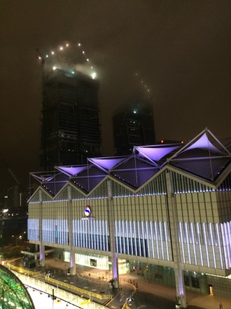 あとで聞いたら、数カ月ぶりの大雨だったようです。建設中ビルの上のほうが霧で霞むほど。