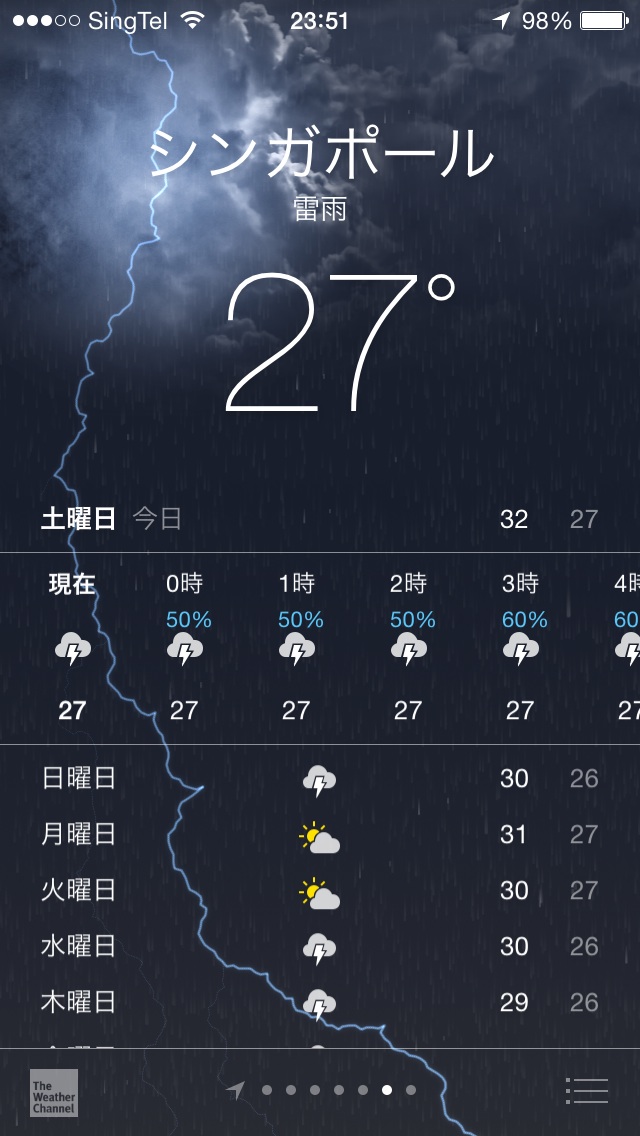 ちなみにシンガポールは赤道直下の熱帯気候。気温は最高でも32〜33度ほどですが、なんといっても湿度が半端じゃない。 常時80〜90%程度の湿度なので、冷房のないところにいるとじっとしていても汗が噴き出してきます。 街中なのでそこら中に冷房の効いた施設があるので、ちょっと外を歩いたら涼しいところに飛び込んで休む、を繰り返さないとかなりツライです。