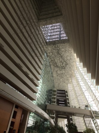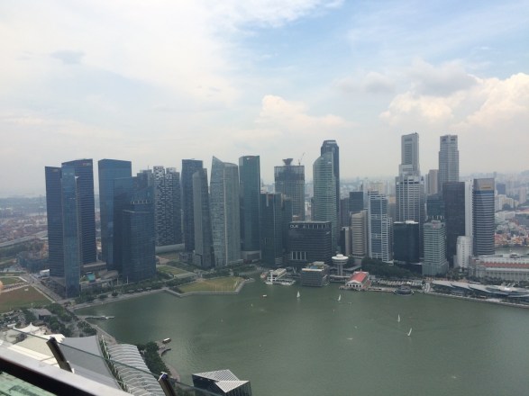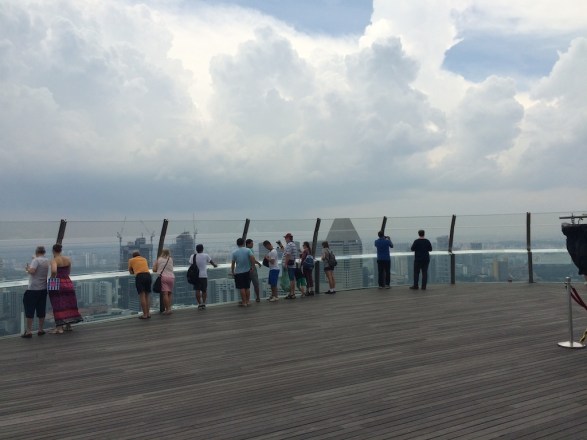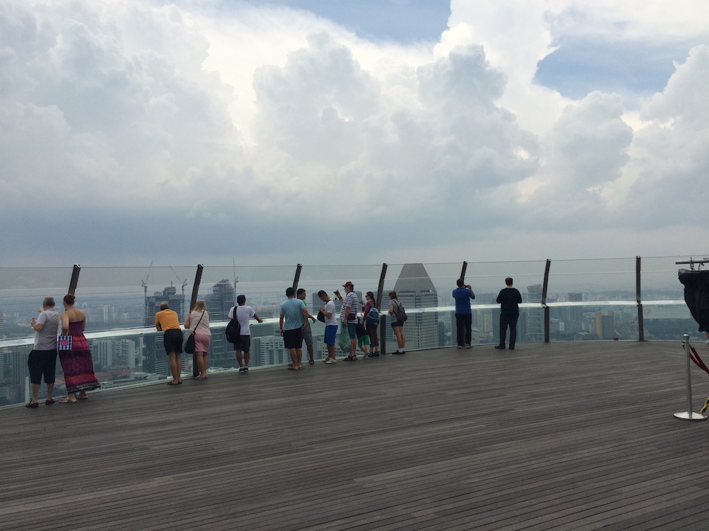ただのビジターでしたが、正面玄関から入って展望台「サンズ・スカイパーク」があるタワー3までテクテク歩いてみます。 展望台の入り口で23シンガポールドル(SGD)を払って、直通のエレベータに乗ると、例の上に乗ってる船っぽいデザインの舳先部分にたどり着きます。 (ちなみに屋上のプールがあるところはゲストオンリーでビジターは入れません)
