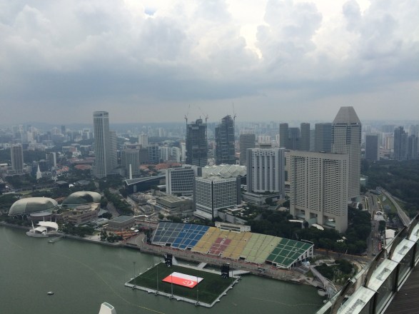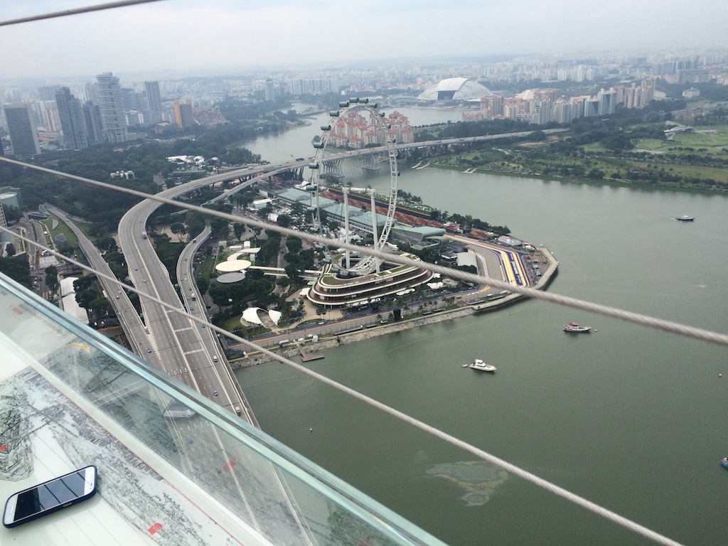この辺では一番高いのかな〜、対岸のビルが小さく見えます。 自分たちの指定席のあるベイ・スタンドや、ホームストレート手前の最終コーナーと世界一の大きさを誇る観覧車「シンガポール・フライヤー」が見えます。