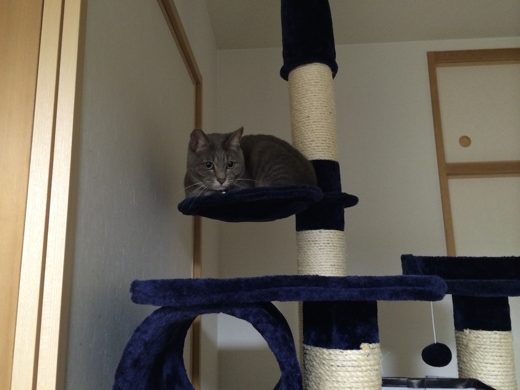 去年キャットタワーを新調した当初は、自分で登ることもなく、乗せても嫌がってすぐ降りてしまっていたのに、なんで今さら快適なことに気づいたのか。 とにかく、日中はよくここでくつろいでいます。 下僕どもの様子がよく見えていいのでしょうかな。