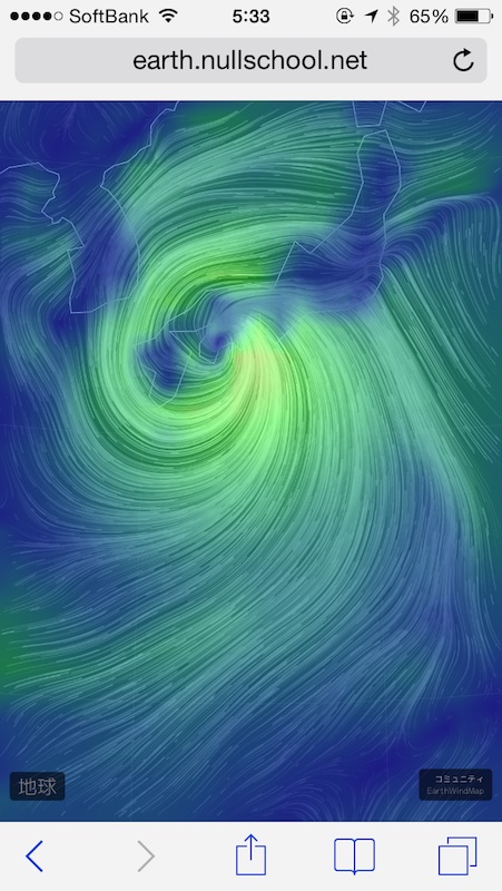 地球全土の大気の流れ??が分かるらしきアプリで、アニメーションで風が流れてて分かりやすいのと、日本近辺以外もすべて見れてオモシロイ。 試しにいま来ている台風11号の動きを観察していましたが、台風情報の現在位置とまあまあズレなく表示していて、精度も高いようです。 | | | | |