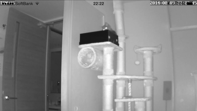 iPhoneからボタンひとつで静止画や動画も撮れるし、音を聞いたりこっちの音をカメラから出したり(つまり通話)も可能。 あまつさえ、さほど期待していなかった暗視モードが意外にも使える。 明度センサーが閾値を超えると自動で赤外線LEDが点灯し、暗視モード(モノクロ)に。 見た目はLEDがぼんやり赤色に光っているだけですが、実際の映像はこのとおり、ネコの目が反射するくらいハッキリ写っています。(もちろん真っ暗闇です)