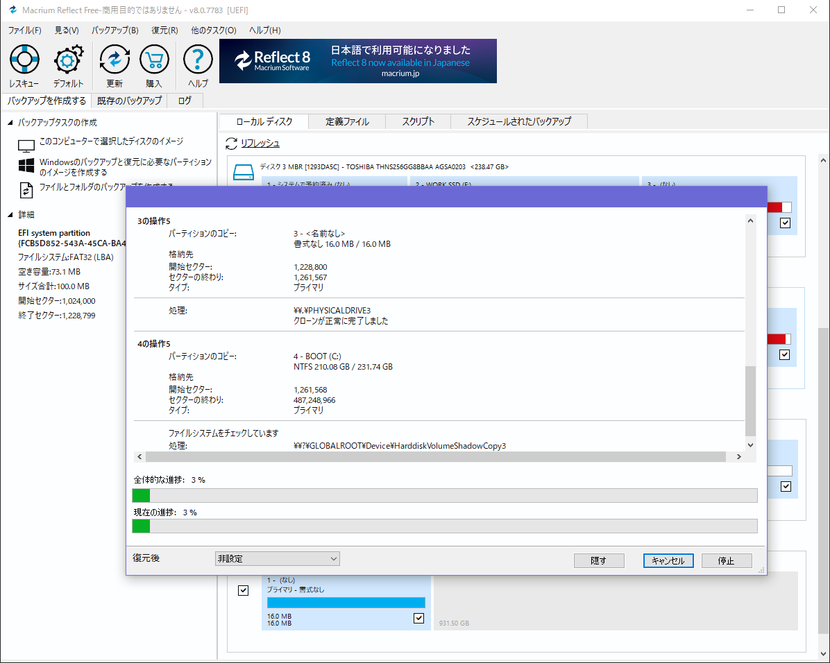 ブートドライブの容量を見たところ、なぜか1TBではなく256GBのまま。 うーむ、256GBのドライブは抜いたはずだが。 Macrium Reflectで表示してみると原因が分かりました。 256GBのクローンを作成したので、そのまま、256GBのサイズでクローンしてたのです。 なるほど、クローンってそういうことになるのか〜、今までは同容量のドライブに交換してただけなので気づかんかった。 まあでもパーティションツールで簡単にサイズ変えれるやろ、と思いましたがそうは問屋が卸しませんでした。