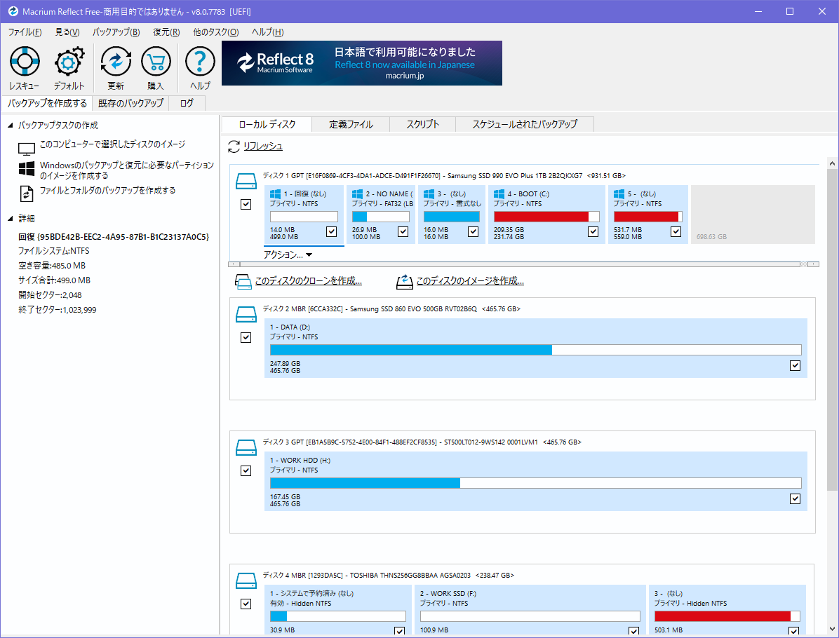 OS再インストールなしでブートドライブを交換するにはWindowsだけでは出来ないので、社外アプリが必要です。 (Win2000の頃は無理くりコマンドプロンプトだけでやったこともあるけど) 過去に2度ほど使った「Mini Tools」というアプリが無料で簡単で安全だったので今回も使用予定だったのですが、なんと現在のバージョンは有料。 30日の無料期間等もなく、いきなり月額数千円はちょっといやらしい。 数年に1回使うかどうかというアプリに払うのはなあ・・・。 と思っていろいろ探すも他のアプリも大抵同様のプランで、オープンソースのアプリくらいしか完全無料はない。 オープンソースのはCUIだったりでちょっと操作がややこしくハードルが高いので、ChatGPTに無料のGUIで使える完全無料はないのか聞いてみたところ、「Macrium Reflect free 8」というのが非商用なら無料らしい。 但し、最新バージョン(有料のReflect 8.1)のリリースと共にこちらも配布は終了しているが、ミラーサイトが残っているとのこと。 そんなことまでChatGPTは知っているのか、スゴイ。
