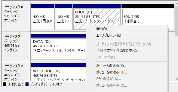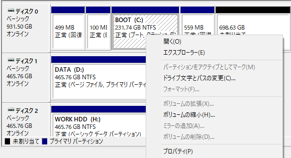 ググってみると、今どきは社外のパーティションツールを使わずとも、Windowsの機能で動的にパーティションサイズを変えられるらしい。 ディスクの管理画面でブートパーティションのコンテキストメニューにある「ボリュームの拡張」をすれば良いみたいですが、自分のブートパーティションではなぜか「ボリュームの縮小」しか選択できない。 これもググってみると、どうやらすぐ隣に「回復パーティション」があるかららしい。 これを削除すれば「ボリュームの拡張」が出来るようですが、これはディスクの管理画面では出来ずコマンドプロンプトが必要。 まあ書いてあるコマンド打つだけだしと思い、ちまちまやってみました。