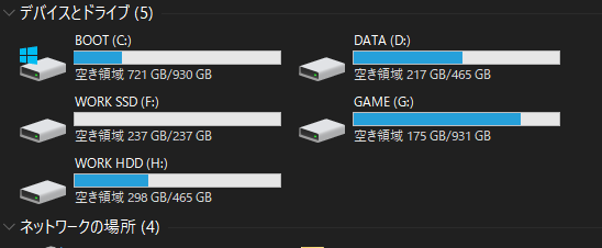 | ウチのWindows10 PCさん(Win11はいろいろ信用ならんのでまだアップデートしない)ですが、データドライブはいろいろと追加していて、 古いのも合わせて現在4ドライブ(SSD3個+HDD1個)でさらに外部にNASドライブもありますが、ついにCドライブがいっぱいになってしまいました。