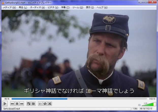 なぜかいつも同じシーンから以降の字幕が、VLCでの再生中に表示されなくなってしまうのです。 初めはSRTファイルが悪いのか、といろいろ試してみたのですが、そもそもSRTファイルというのはタダのテキストファイル。 それもややこしいフォント設定や字幕位置の設定など何もない、純粋に字幕の時間タグしか書かれていない書式のもの。 こうなると字幕側じゃなくて動画ファイル側の問題じゃないか、ということになり、試しに全然別の長時間動画ファイルに、その字幕を載せてみました。(F1総集編に南北戦争の字幕w)