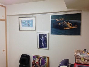 ブラケットを6箇所ネジ止めしたら、レールをパチンとはめるだけで完成です。 まあまあ簡単なんですが、天井近くの高所作業のため、結構疲れますw 3部屋のレールが固定できたので、あとは絵を飾るだけ。 リビングのTVの上には、メインの天野喜孝のシルクスクリーンを、和室には笹倉鉄平と小さい天野、それからなぜかロータス100Tの中嶋悟。