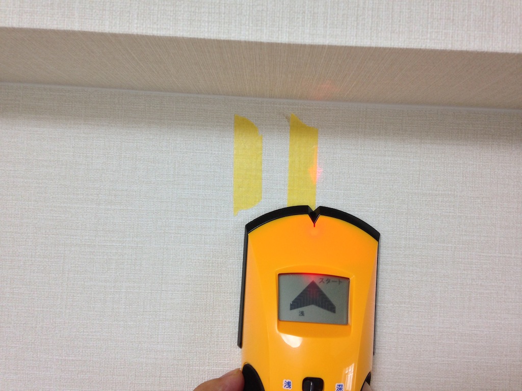 一応電波式の方は、壁うらの配線とかがあると検知するようになっているし(当てになるかどうかは分からんが)、どこ太くんのほうには先端に磁石がついており、壁紙に隠れて見えない石膏ボードを固定している釘やホッチキスがあれば磁石が反応するので、上からネジ釘を挿して断線などの失敗することを防いでくれます。 調べてみると、下地材はほぼ30cm間隔で立っていることが分かりました。