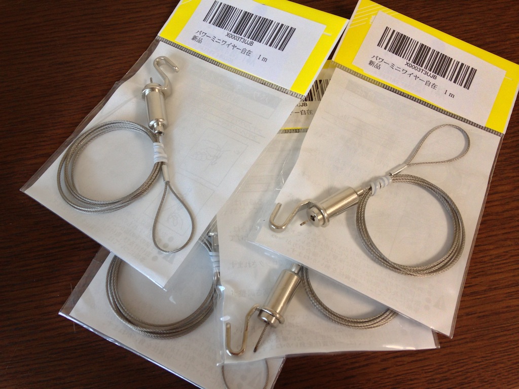 こうしてレール取付箇所の確認が完了したので、肝心のピクチャーレールを物色しました。 基本はそこそこの重量まで耐えれて安くてスタイリッシュなヤツ。 ネットで色々探すと、8kgまで耐えれて2m3000円弱でフックや固定用ブラケットがセットになっている物を見つけました。 ワイヤーフック以外がセットになっていて、一応このセットだけでピクチャーレールが完成します。 ワイヤーフックも欲しかったのですが、純正品が思ったより高かったので、他で安いワイヤーフックを見つけてそちらにしました。