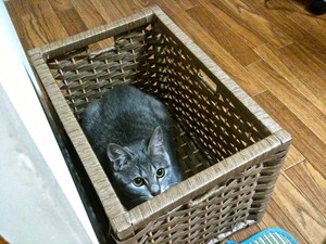 最近シマコが好きな、籐カゴの中とメタルラックの上段。 ちなみに、掃除機が来ると、食器棚の上の最上段で監視作業に入ります。 ホントに怖いことがあると、キッチンストッカー裏の隠れ家です。