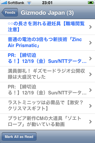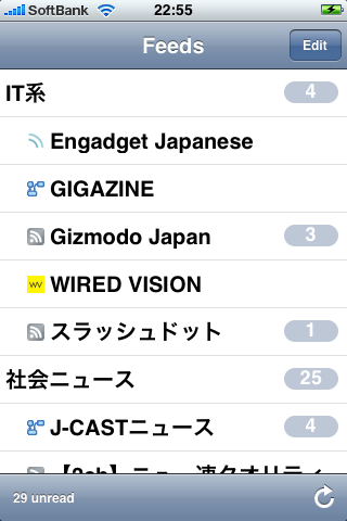 ●RSSフィードリーダ「NetNewsWire」(無料) RSSリーダもかなりの数がリリースされているのですが、このアプリは最初期にリリースされたものです。 いくつか他の類似アプリも試しましたが(450円もする「Byline」も)、結局これが一番気に入ってます。 理由は、フィード登録方法とカテゴリ分けが出来る点です。 フィード登録はNewsGatorサイトでユーザー登録をして、PCから登録を行なうのですが、 LiveDoor等のリーダーサイトと比べると結構サクサク出来るのです。 しかもGoogleリーダーやLiveDoorでは、登録したフィード名が変更出来ない(元サイトの名称そのまま)のに対し、 NewsGatorでは変更出来たり、結構融通が利きます。 (名称変更は、長過ぎてiPhoneの画面では切れてしまうサイト名を短くしたり、Yahoo!Pipesを経由した場合などに便利) さらに、カテゴリ分けは他のリーダーサイトでも出来るものの、それらのiPhone用リーダーアプリでは反映されず、ごっちゃになって表示されてしまうのですが、 NetNewsWireではちゃんとカテゴリごと、サイトごとにフィードが表示されるので、 「同一カテゴリのサイトは並べて表示させたいけど、フィードはサイト単位で見たい」ボクの要望に見事合致しています。