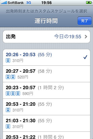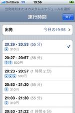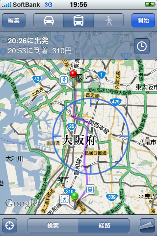 出発・到着地を入力してから、移動方法を選択出来ます。 電車移動の場合、「開始」ボタンの下の時計マークをタップすると、乗り換え経路選択画面になります。 ・・・とは言え、現状では詳細がまったく表示されていないので、選択のしようがありませんが。