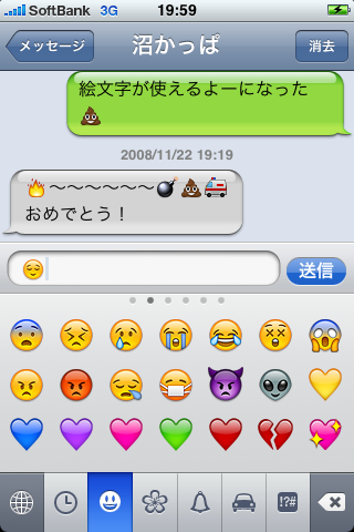 残念ながらまだ他キャリアとの互換性がありませんが、ソフトバンク同士なら問題なくいけるようです。 過去に受信して化けていたSMSの絵文字も、ちゃんと表示されるようになりました。