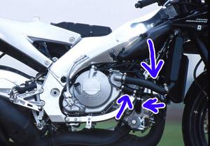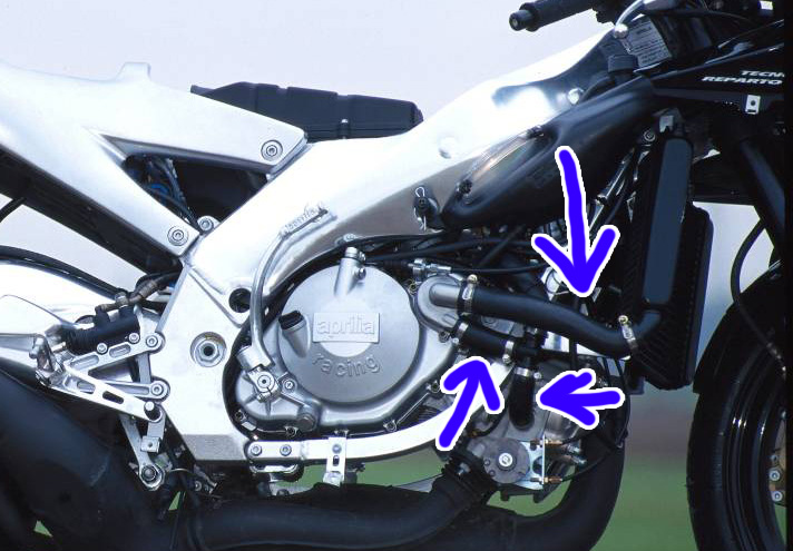 | アプリリアのエンジン周りを巡っている、 冷却水用のウォーターホースがあるのですが↓、