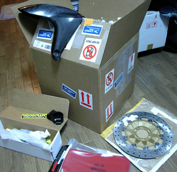 | 今日はパーツがいろいろと届きました。 カーボンのシートレールと、バッテリー、そしてなんと、アメリカAF1Racingで5/2に注文した4点セットが、もう届いてしまいました!! はぇぇ〜