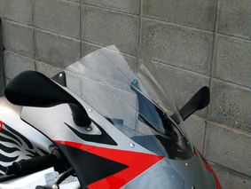 イイ写真がなかったので、とあるRS250オーナーの個人サイトからの転載ですが、ご覧のとおり、MRAのレーシングスクリーンは段付きになっています。 段付きで防風効果を高めつつ、歪みの少ない視界を確保している商品です。