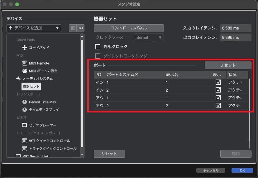 その上で、Cubaseを立ち上げ直してスタジオ設定から、ASIOドライバとしてこの機器セットを選択、機器セットのプロパティ画面で入出力ともにチェックを入れると利用できるようになります。