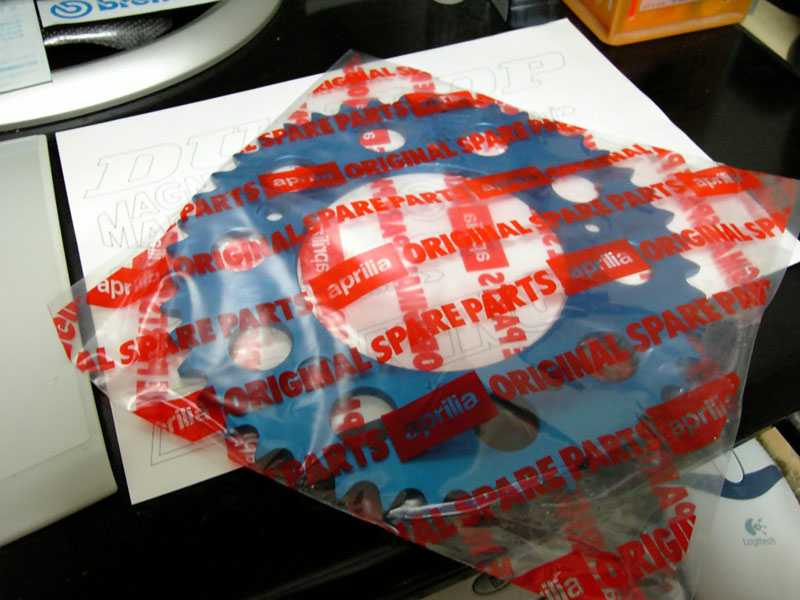 で、今回落札したスプロケットは社外品だと思ってたんですが(デイトナは日本のカスタムパーツメーカー)、届いたパッケージは思いっきり「aprilia ORIGINAL SPARE PARTS」。 純正品とまったく同じパッケージです。 つまりこれは、デイトナ製のパーツが純正品になってるってことか。へえ知らんかった。 ま、そんだけです。