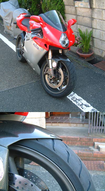 そしてFプロファイルの変更。120/65から120/70へ。 微妙な扁平率の変更ですが、写真を見てのとおり、Fフェンダーとのクリアランスがギリギリ。 隙間が1mmもない部分があります。 路肩を走って石ころを巻き込んだら、フェンダー割れるかも・・・まあ大丈夫か、カーボンだし。