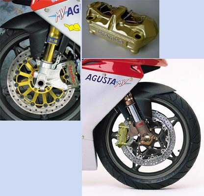 これはやっぱりキャリパーをブレンボに換えるしかないのです。腐ったニッシンから。 で、写真をコラージュしてアグスタにラジアルキャリパーを取り付けてみました。これを使ってキャリパーサポートの形状をどうするか、考えることにします。キャリパー代含めて、20万あったら何とかなるかなあ・・・ |  |