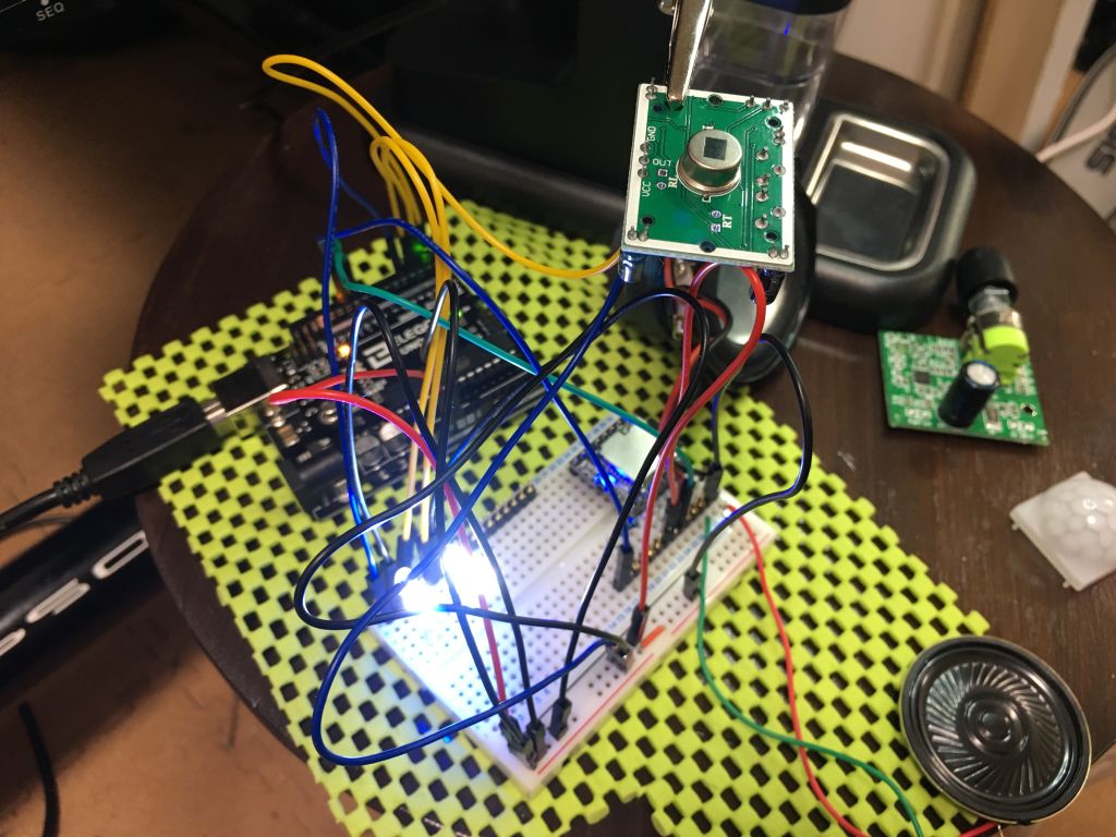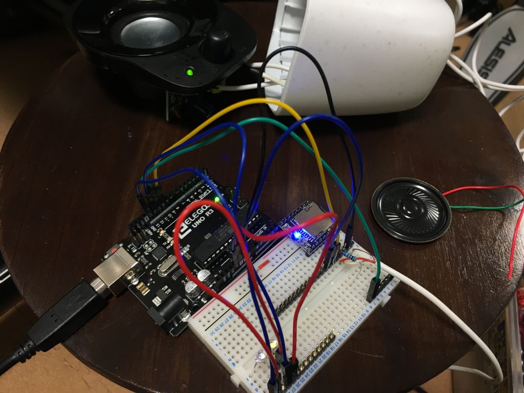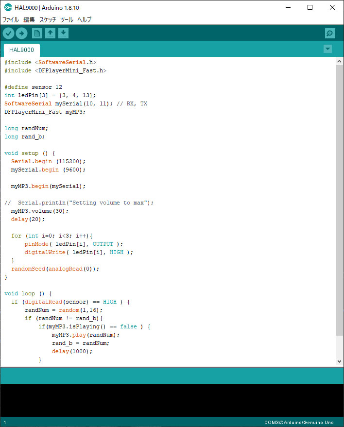 なんだかんだでテスト基盤を組み立てて、プログラミングも試行錯誤しながら(いろいろググって)設計し、なんとか理想の動作をするようになりました。 ボイスはとりあえず「2001年」と「2010年」から実際にHALがしゃべっているシーンを切り出して、印象的なセリフ15種類をMP3化しましたが、 プログラムではただ単にランダムにSDカード内のMP3を再生してるだけなので、あとから追加してもほぼプログラム変更せずに対応できます。 もちろんただのMP3なので、セリフ以外の音楽とかでもなんでもいけます。