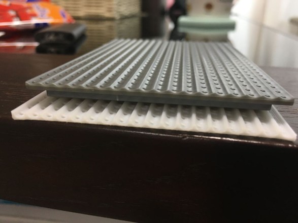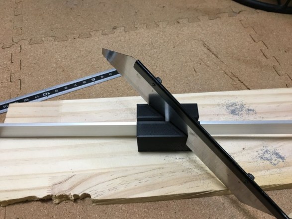 さて回路設計は完成しましたが、外装パーツがまだまだです。 ベゼル用に3o厚のアルミ平板を買ってきましたが、角の部分は正確に45度にカットしないとぴったり合わないため、フリーハンドでは難しい。 が、金属の精密切削工具は高いし、たった8か所の45度切断くらいなら治具を作ればフリーハンドでもなんとかなりそうと思い、せっかく買った3Dプリンタで治具も印刷しました。 3o平板がピッタリ入って動かないスリットに45度のレザーソー用スリットの付いた治具と、切断後に正確に45度でヤスリを当てられる治具。