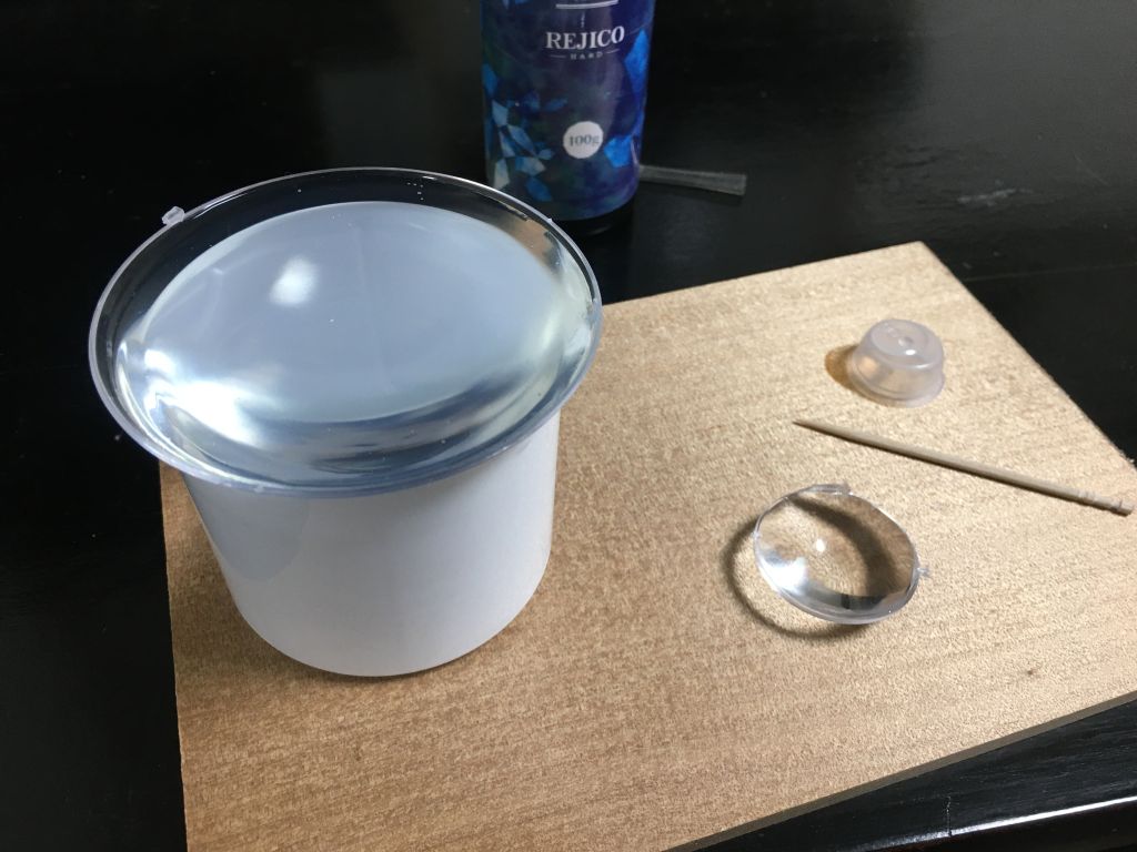 4万円ほどのFDM式3Dプリンタを購入し、スピーカーグリルを印刷してみると・・・思ったより綺麗に印刷できました。最新の3Dプリンタは凄い。 これならNIKONのレンズボディ部分(フォーカスリングの文字入りで)も作れるんじゃないか? しかし3Dモデルに文字入れすること自体やったことがなく面倒そうなので、こっちは後回しにしてレンズをいじってみることにしました。 外型そのものはキットのクリアドームで問題ないので、内側に透明樹脂を流し込んだら凸レンズになるじゃん?と単純に考え、エポキシのクリアレジンを買ってきました。 いきなりメインレンズに流し込んで失敗したらイヤなので、内部のサブレンズでテストすることに。