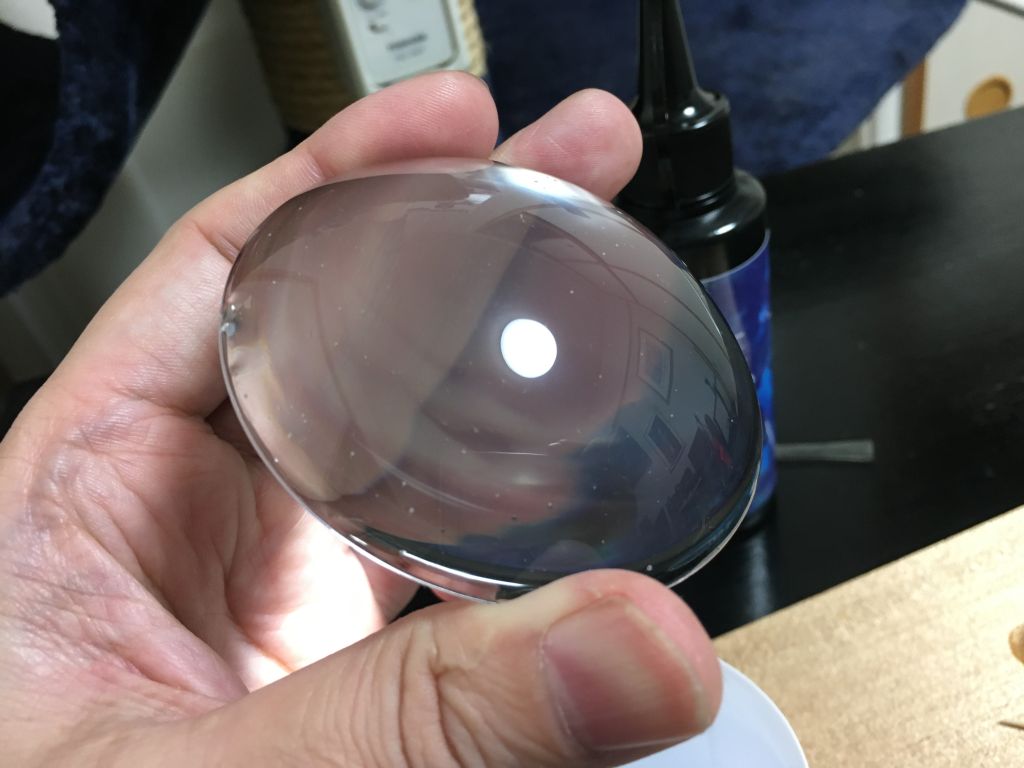 が、結果から言うとこれこそちゃんとテストすべきだった。 いきなりメインレンズの内側にナミナミとUVレジンを注ぎ、UV-LEDを照射してみると・・・おおっわずか数分で固まっている!凄い・・・しかもちゃんと凸レンズになったよ。 ・・・満足してたら、実は硬化していたのは表面だけで中はドロドロのままだったため、しばらくすると内部に気泡ができ浮いてきて、表面をつついたら中身が流れ出してきました。 もう元には戻せずレンズパーツをダメにしてしまい・・・レンズ全体を自作せねばならない状態に。 まあでも、エポキシレジンもUVレジンもあるし、なんとかなるだろ・・・とこのときはそれほど問題と思ってなかったんですけどね・・・その後こんなに苦労するとは。