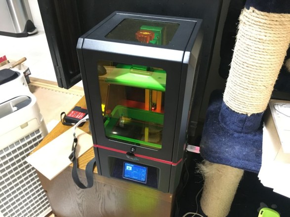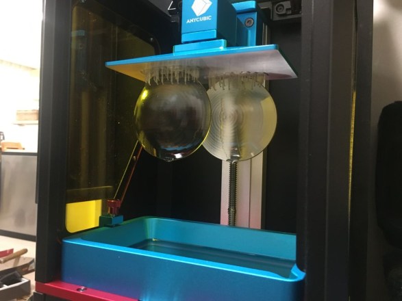 エポキシだけでは黄変するらしいので、一番表面部分だけUVレジンを薄く塗って硬化させ、その後オスメス型を合わせてエポキシを流し込みました。 型の隙間からダラダラ樹脂が流れ出し、途中で何回か樹脂を足す必要があってうまくいってる気がしなかったのですが、とりあえず一晩放置。 硬化後型から取り出したところ(結局型枠は破壊する必要があったが)、予想どおり大失敗でした。 樹脂が流れ出して足りなくなってる部分に加え、気泡だらけ。 この後も何度か型枠の方法を変えて流し込み製法を試しましたが、何度やってもどんなに工夫しても(気泡を抜くために粘度を落としたり振動を与えたり・・・)細かい気泡は消えませんでした。 慣れない手法でいまさら努力するより文明の利器を利用しようということで、手流し方法は諦め3Dプリンタに解決を求めました。 もちろん、いまあるFDM方式では透明フィラメントを使ってもレンズが作れるほどの透明度は出ない(無理くり試してる人はいたが)。 となると別の方式である、光造形方式くらいしか知らない。(後で調べたらプロレベルでは他の方法を使ってレンズを作ってるみたい) で、レンズを作るために光造形式の3Dプリンタを購入。
