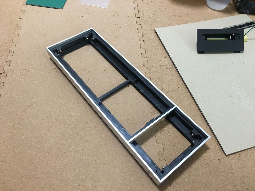 そもそもの本体フレームは当初5o厚の発泡プラ素材(何たらフォーム)で枠組を作ってみましたが、精密作業が超下手糞な自分には歪んだフレームしか作れない・・・ 結局これも正確に90度が出せる3Dプリンタで。 ただし、購入した3Dプリンタは以前よりは大きいものが印刷できるといえ、200mm四方程度が精一杯で300mmを超えるフレームは一発で作れないので、4分割方式です。 2分割ではなく4分割なのは、背面間接照明スペースのことと元キットよりアルミベゼルの厚みを薄く見せたいために2段構成にしたから。 映画のHALのインターフェイスは壁に埋まっていますが、実際に壁に埋め込むわけにはいかないので、映画同様薄く見せるにはこういう仕掛けが必要。