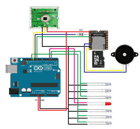 外装がほぼ完成したので、最後にArduino本体、DFPlayer Mini、人感センサー、各LEDライト、スピーカーを内部に配置し、配線を施し(一度目は配線が汚すぎたのでやり直し)、ついに完成しました。