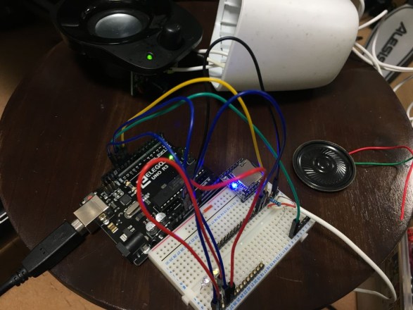 ちなみにHALのボイス回路はレースSIMコントローラ製作時に間違えて買って余っていたArduinoUNOで作ろうと思ったのですが、 Arduinoのメモリはせいぜい数百KBくらいしかなく、とてもボイスデータが入る余地はない。(8kbpsくらいの低音質なら出来るかも知れんが) ArduinoでMP3を鳴らす方法はないものかと調べると・・・ちゃんと方法はありました。しかも割と簡単な基盤追加で。 「DFPlayer Mini」というArduino用のアドオン基盤があり、これにはMP3デコーダ+D/Aコンバータ+スピーカアンプ+マイクロSDカードスロットが一体になったもの。 しかも超小型なうえに2個セットで700円くらいと激安。 基盤にアンプも内蔵しているので、あとは適当なスピーカーさえあれば音は鳴らせる。 ただし音量が手動調整できない(スクリプト内で調整はできるが)ので、別途アンプを付けることも可能ということで、 手持ちで使わなくなったPC用スピーカーを分解して、スピーカーと合わせて一応アンプ基盤も取り出しておきました。まあ結局使わなかったけど。