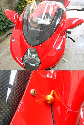この間の日曜にモーターサイクルショーに行った日、 バイク屋に寄ったとき、工場長のDUCATI998が留まってました。 で、何気なく998を眺めてたら、純正で使われているカウルや スクリーン用のボルトがちっさくて結構カッコいいことに気づき、