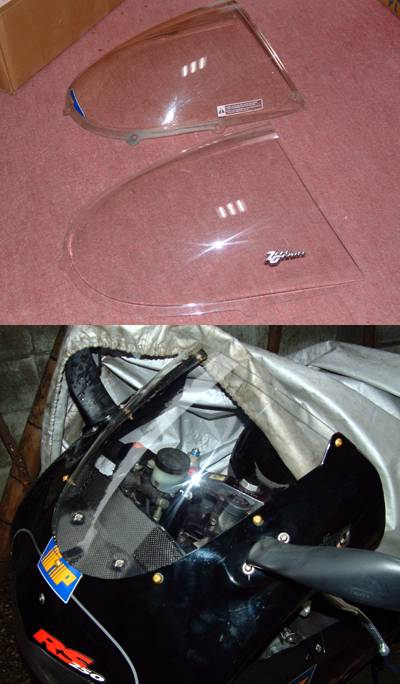 上の写真が到着直後。 手前がアメリカ製製品、奥が純正のスクリーン。 純正はアクリルではなくポリカーボネイト製のヤツで、 すでにキズだらけ、黄変も起こしてます。