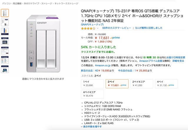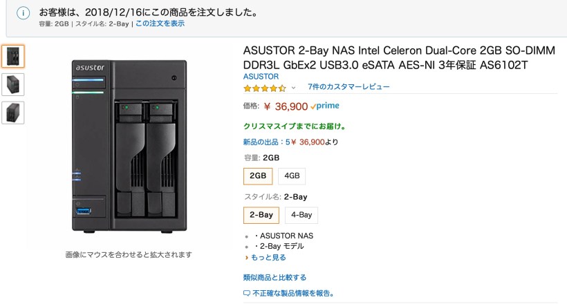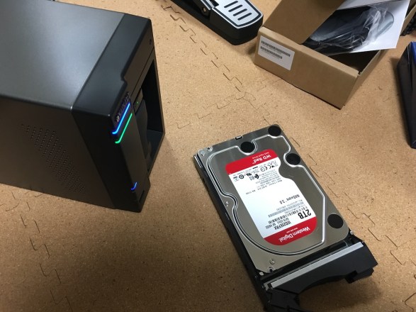 2万円前後のNASは所謂ネットブックとかスマホクラスのCPUなのですが、1クラス上になるとCeleronとかノートPCクラスのCPUを搭載しているようです。 ただのファイルサーバではなくいろいろな機能を持たせようとすると、やはりこれくらいのパフォーマンスは要るよねと思い、ASUSTORのAS6102Tを購入することにしました。36900円。 LinkStationとかは初めからHDDが内蔵されてますが、この手のNASはガワだけで、ストレージは別売りです。 その分、好きなメーカーや容量、HDDではなくSSDにするとかの自由度がある訳ですが、今回はHDDまで選んでるヒマがなかったのでNAS用として定番のWestern DigitalのRED版を購入しました。 AS6102Tはドライブベイが2つあるので、2TBのHDDを2台。1台8500円。