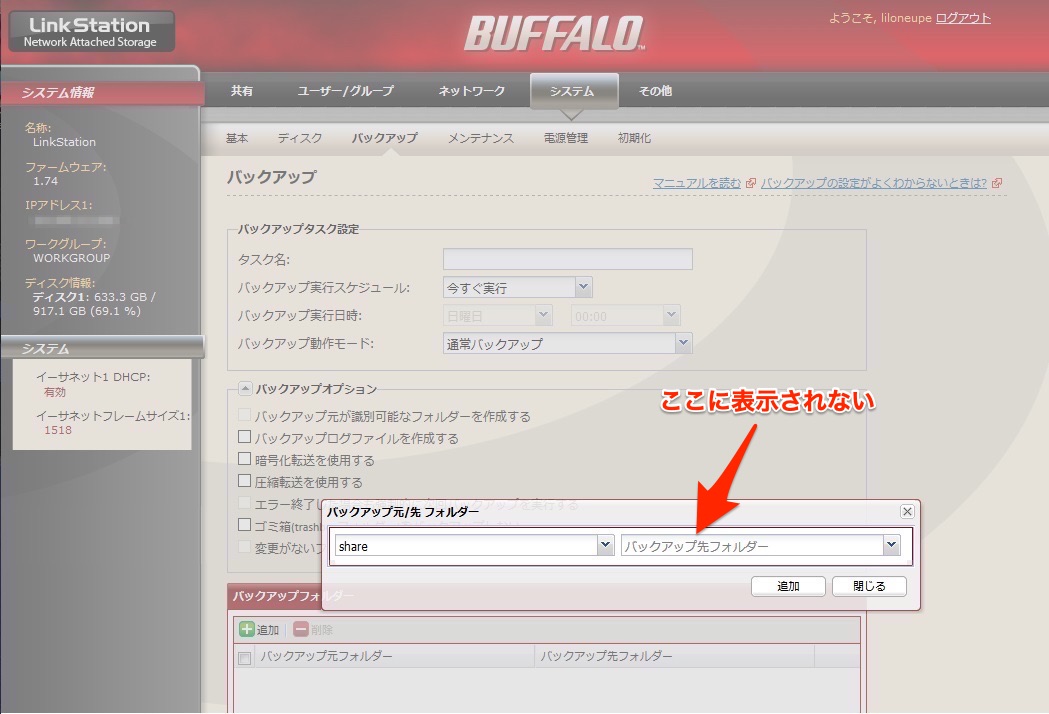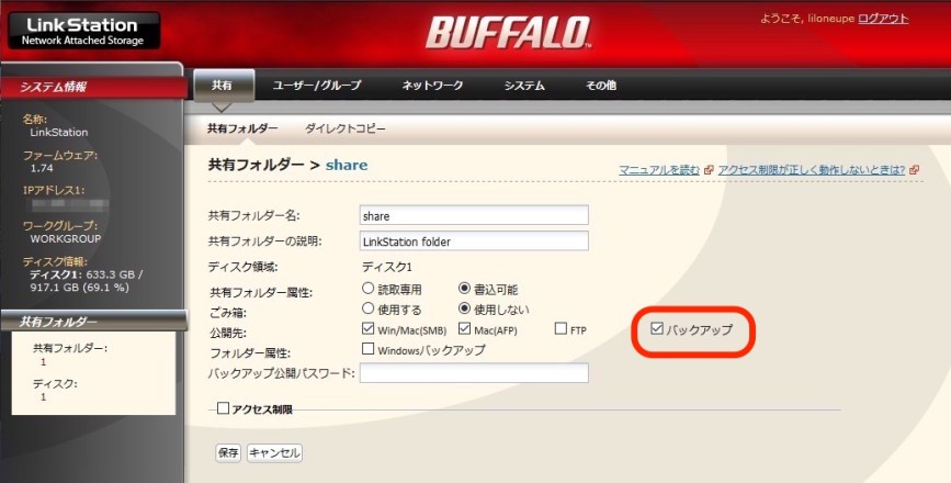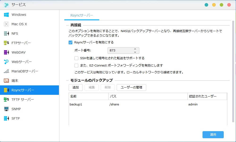 ASUSTOR側のバックアップ機能でも、LinkStation→自分自身にバックアップというタスクを作れるので試してみたが、「モジュールが見つかりません」というエラーが出るだけ。 これはLinkStationがrsyncに対応してないってことなのかな・・・と諦めかけましたが、ASUSTORのバックアップ設定画面で「ポート」に設定されているデフォのポート番号873を別の番号に変えてみると、「アクセスを拒否されました」という違うエラーが表示される。 これは逆にいうとデフォのポート番号は拒否されてないということで、LinkStationもrsyncに対応したポートをちゃんと受け入れているということ。 ということはやはりどこかに設定があるはずだ、しかしrsyncという名称じゃないだけで。 で、いろいろ試行錯誤した結果、ついに見つけました。