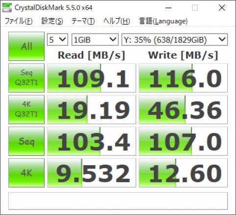 ちなみにASUSTOR AS6102Tのアプリ導入はこれからですが、ファイルサーバとしての速度が気になっていたので、クリスタルマークで速度計測してみました。