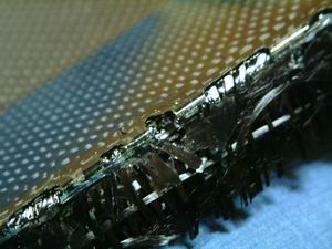 まあそもそも、この「アルミテープを貼る」案は、カーボンクロスを型の形に切り出す際に、 フチがボサボサになったり、クロスの目が歪んだりするのを防ぐには、裏面にあらかじめ何か粘着テープを貼っといたほうがいいよなあ・・・ というところからスタートしたのですが、 どうせなら樹脂を含ませて型に馴染ませるときにも貼ってあったほうがいいのだが、マスキングテープとかだと樹脂が硬化したときに、 そのまま剥がせなくなっちゃうので、樹脂とくっつかないテープ・・・ということで浮上したのがアルミテープでした。 元々、メス型のフランジとかにも多用してるわけだし。